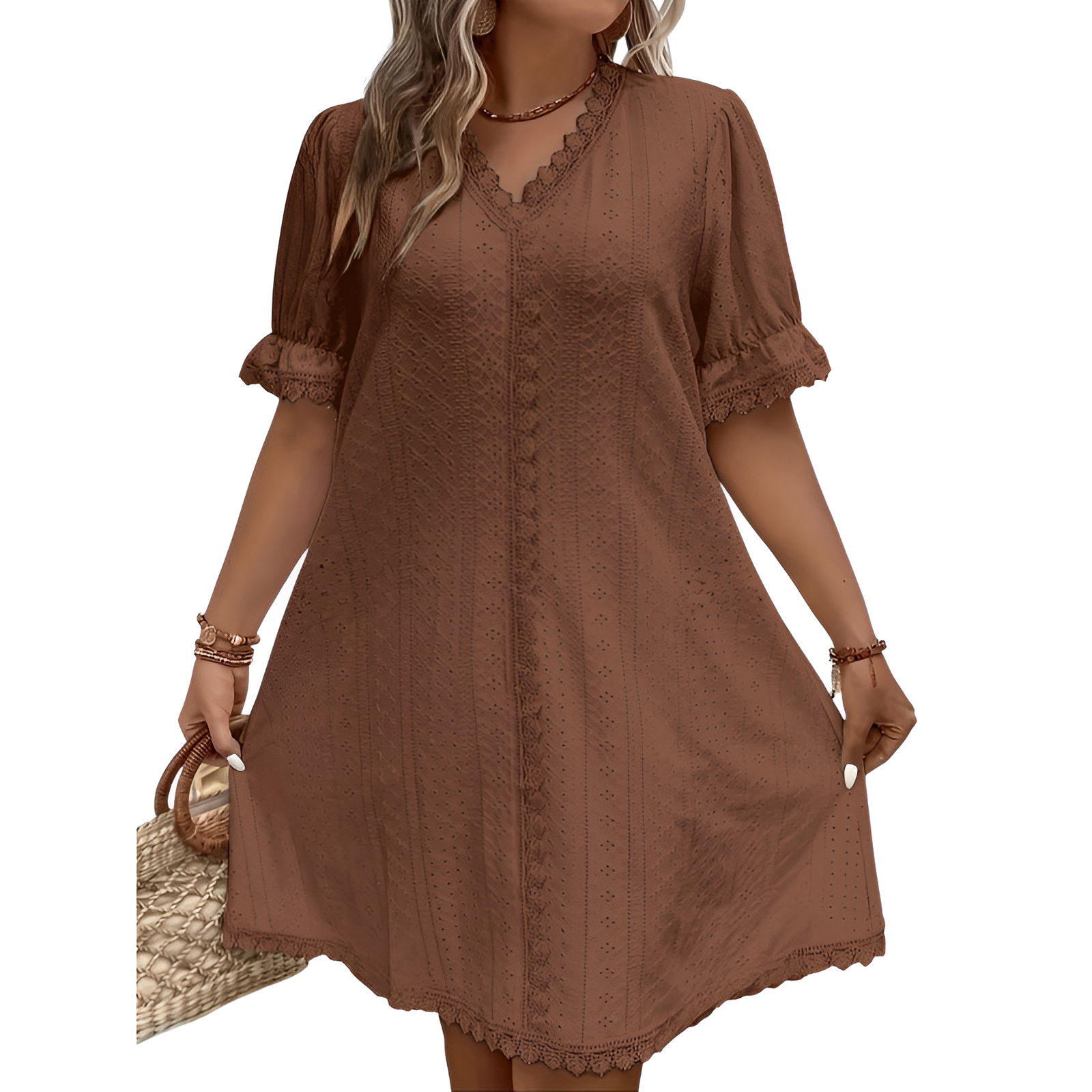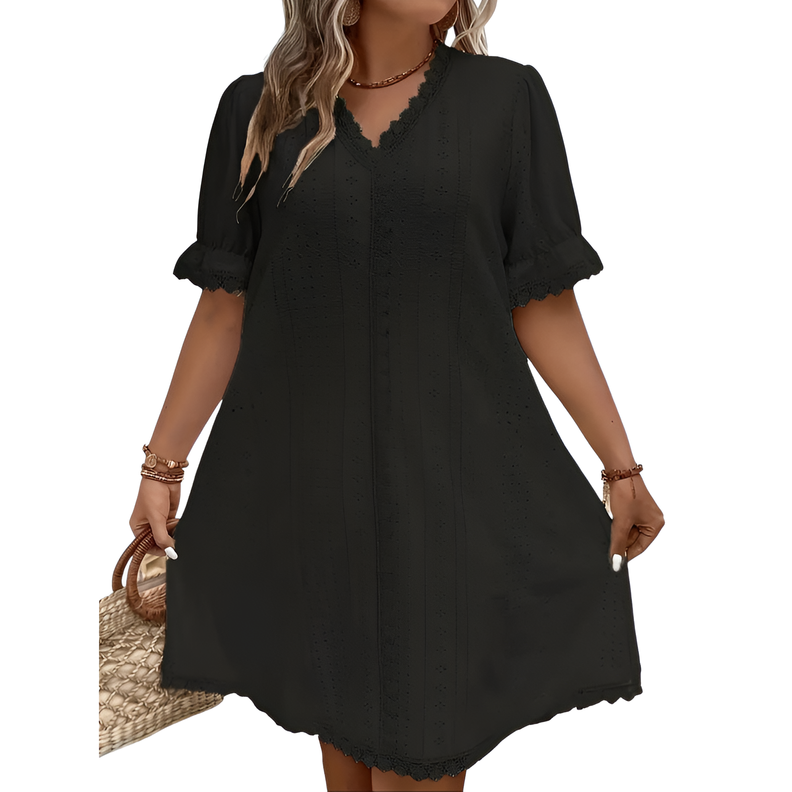 Oplev en perfekt kombination af stil og funktionalitet med denne plus size V-hals kjole. Den flatterende V-hals fremhæver dekolletagen, mens den løse pasform sikrer en behagelig og elegant silhuet. Denne kjole er ideel til både hverdag og festlige anledninger, hvilket gør den til et alsidigt valg i din garderobe. Det lette og åndbare materiale giver en behagelig bæreoplevelse, selv på varme dage.